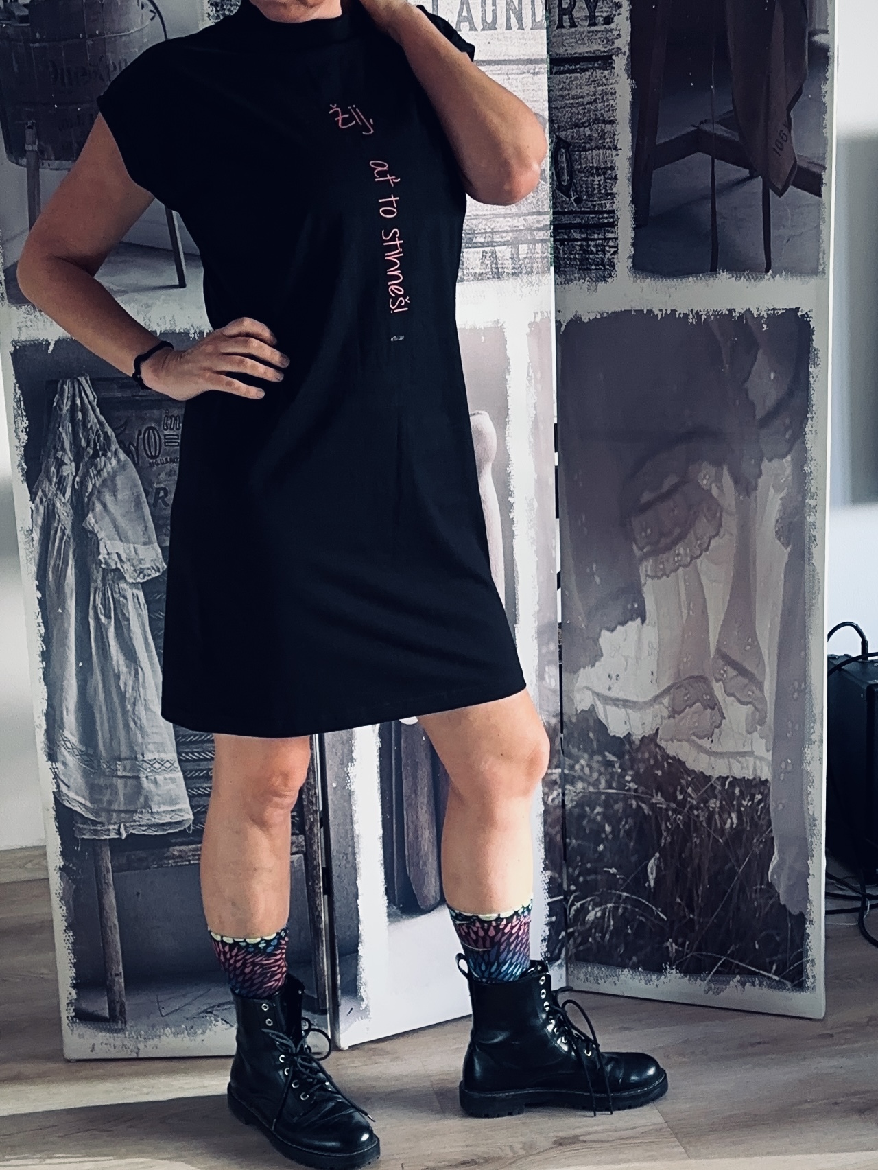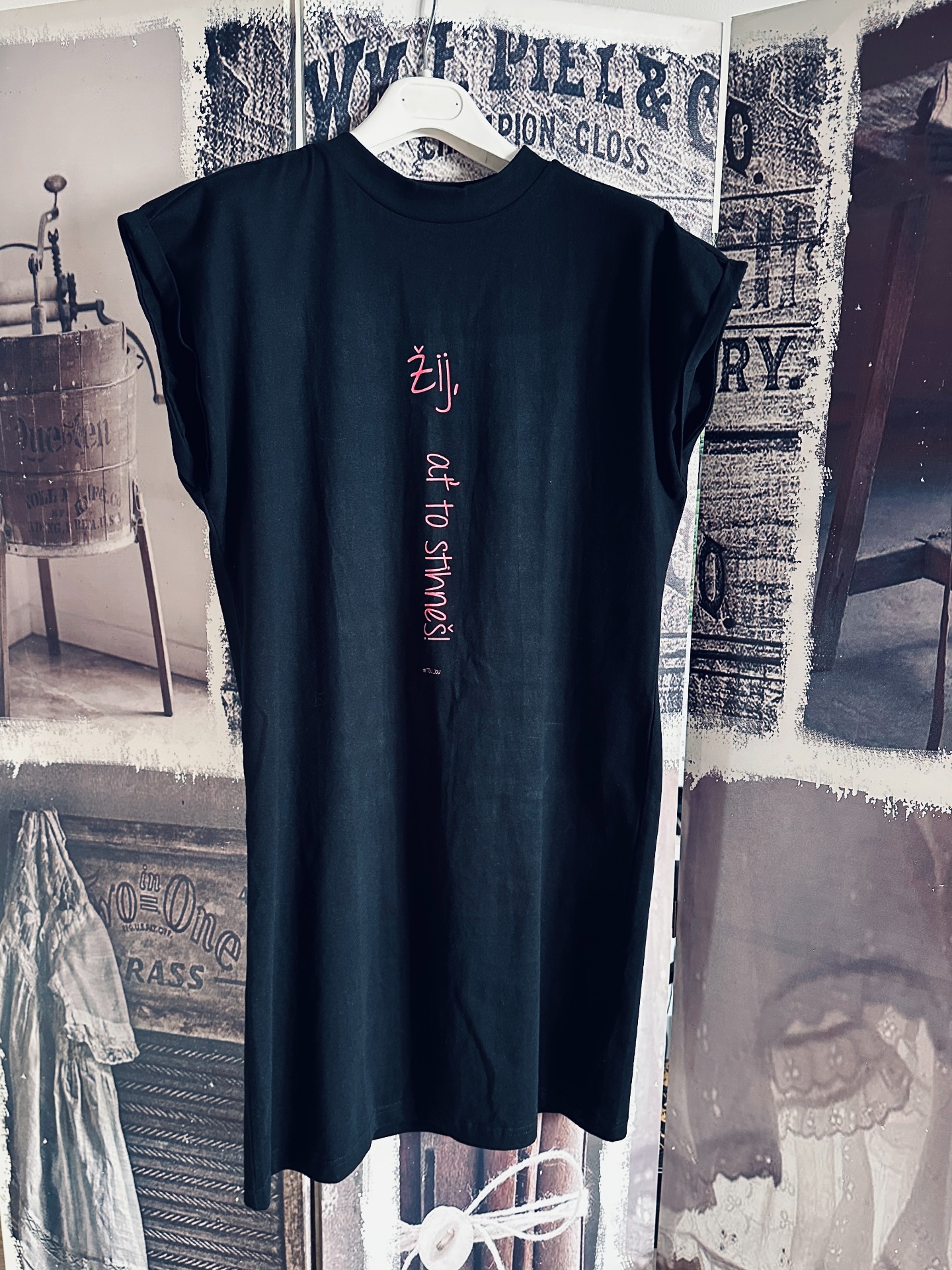Šaty- douhé triko s růžovým nápisem Žij, ať to stihneš!